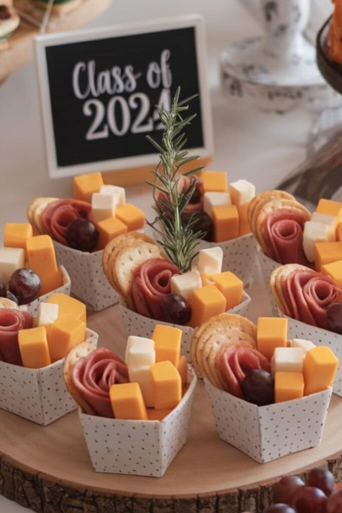 A fancy cheese board, but in a cup. To make these, grab clear plastic cups and fill them with a mix of small cheese cubes, slices of salami or pepperoni, crackers, and grapes or nuts. If you want to get extra creative, add small pretzels, dried fruit, or even a piece of chocolate. These little snack cups are easy to hold and make sure everyone gets their own portion without crowding around a big platter. Arrange them in a basket or on a tray to make them look extra nice. Guests will love having a fun and tasty snack they can enjoy while chatting and celebrating.