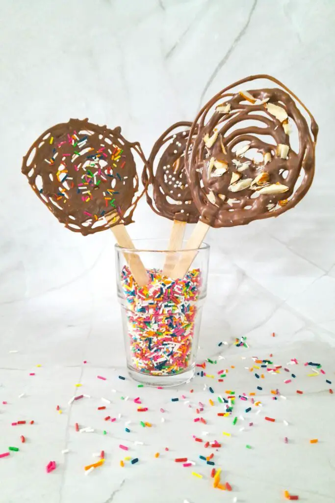 Make sure to try this recipe for your next party or to surprise your kids. My daughter loved the one with colorful sprinklers. These chocolate lollipops look so cute and stylish that you will be surprised that they are so easy to make.