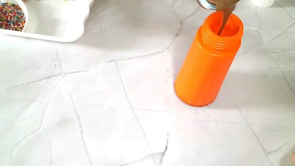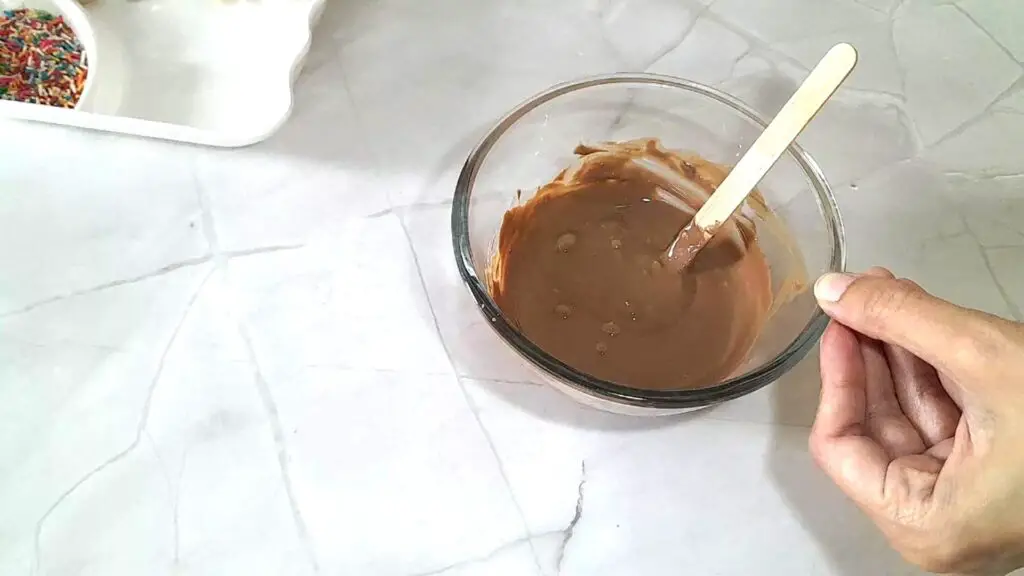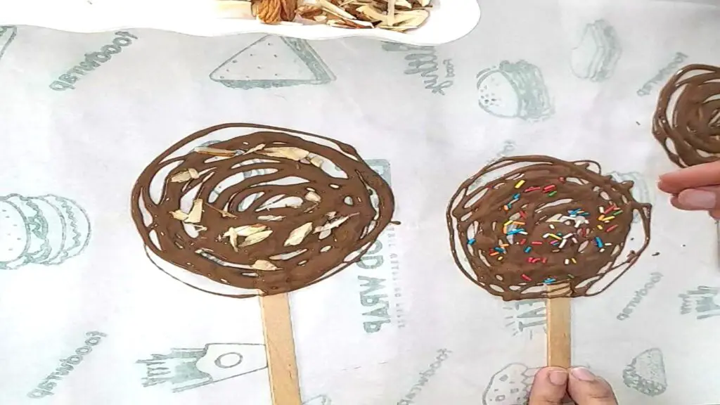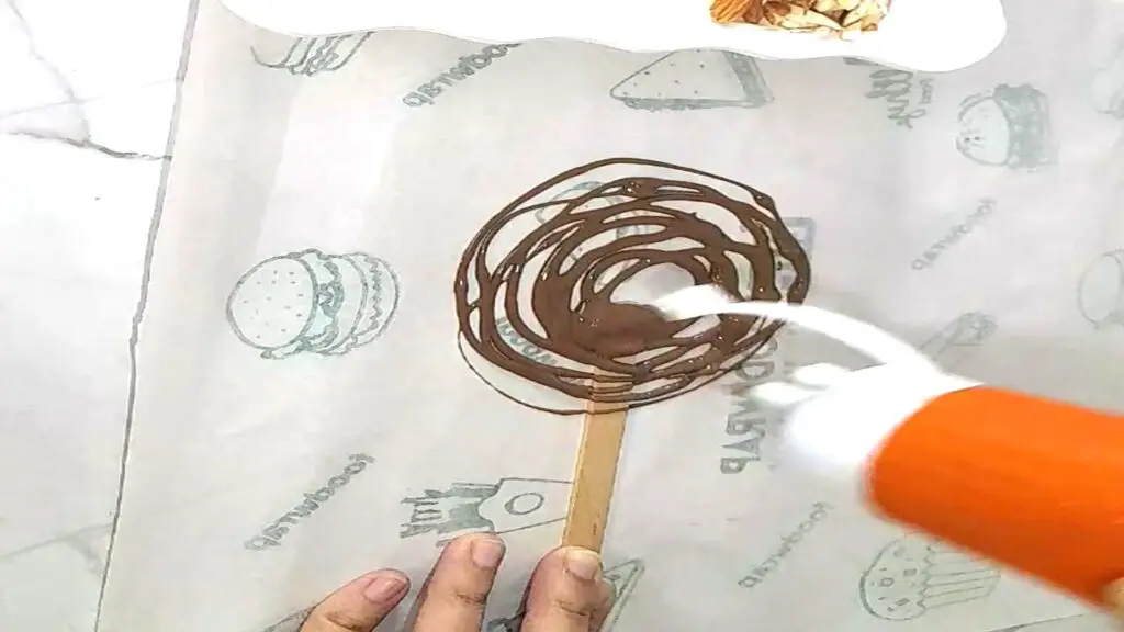 - Now drop some melted chocolate on the tip of the popsicle stick and gently move, while squeezing to make some swirls.