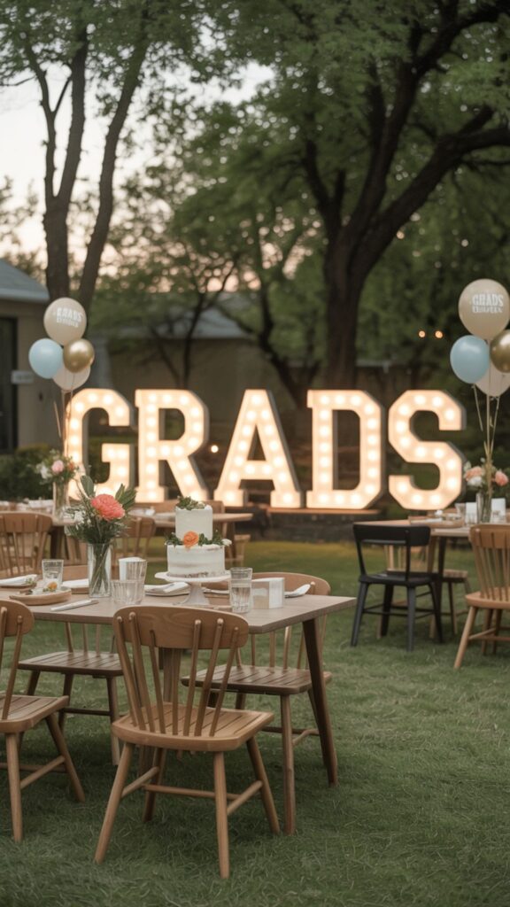 Let the social accounts get filled with stylish graduation photos at a photo booth party. Set up a dedicated photo area with fun and creative backdrops like shimmering metallic curtains, balloon arches, or a neon “Class of [Year]” sign. Give lots of props like oversized sunglasses, graduation caps, funny signs, and feather boas for guests to use in their pictures.
